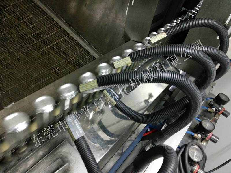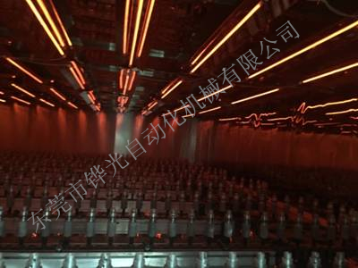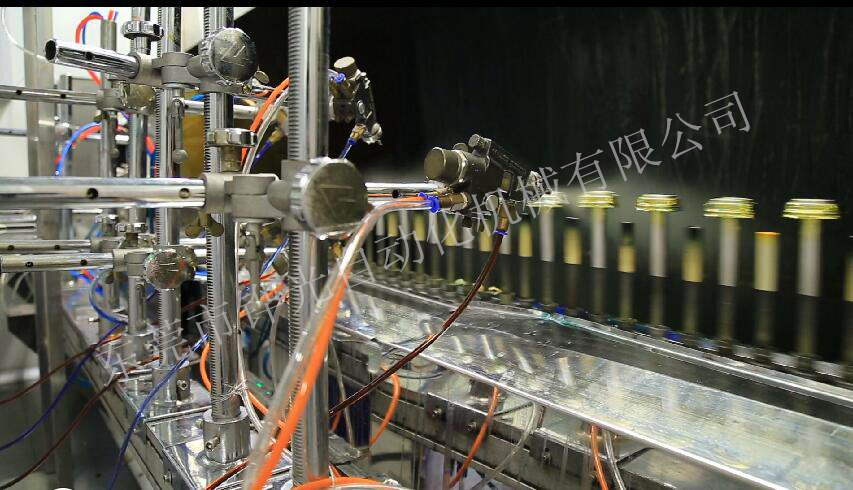 經(jīng)過火焰處理的基材通過輸送傳動鏈進(jìn)入噴房,噴房內(nèi)的噴槍向其噴射涂料.同時基材受強(qiáng)制回轉(zhuǎn)系統(tǒng)的控制而產(chǎn)生自轉(zhuǎn),使基材表面獲得均勻的涂層。