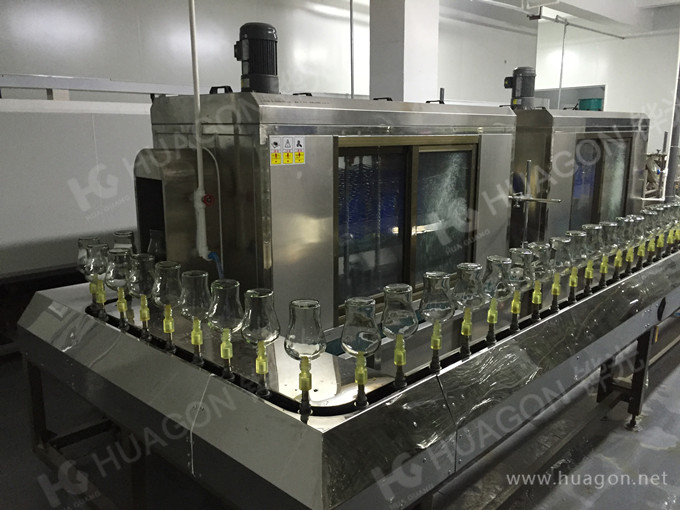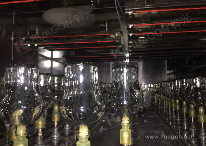 洗瓶:上料-光檢-自動(dòng)清洗一(清潔劑)-自動(dòng)清洗二(清水)-風(fēng)刀除水-熱風(fēng)除水-烘烤-轉(zhuǎn)在線料
